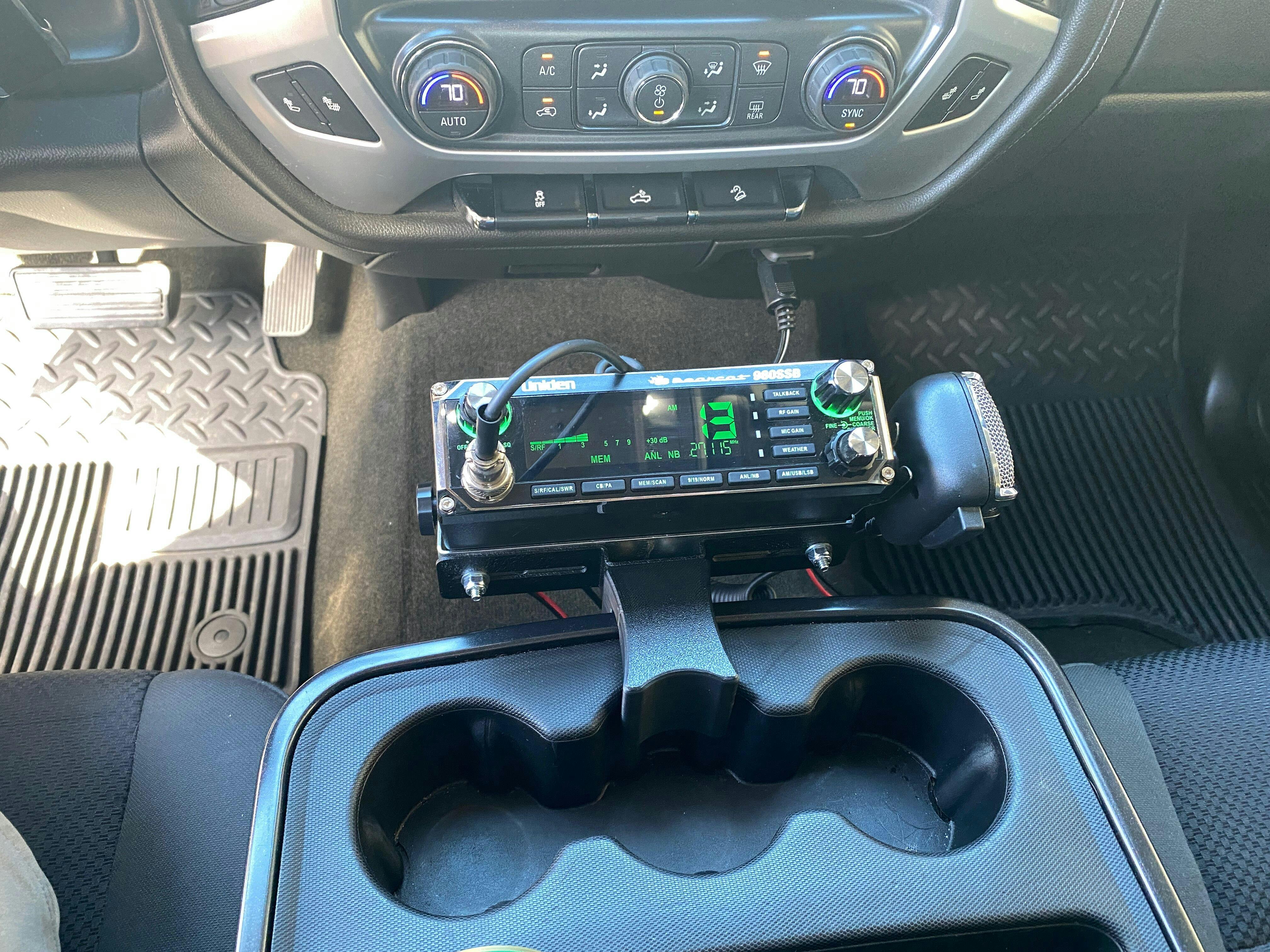 I purchased a newer Chevy Silverado and was looking to mount it without any modification to my center console. Found it with Skymo! Works great and looks good! Fast shipping too! Plenty of leg room for my wife or any passenger in the front seat. I’m running a President Walker 3 FCC and a 4ft. Firestick. The radio gets out!
