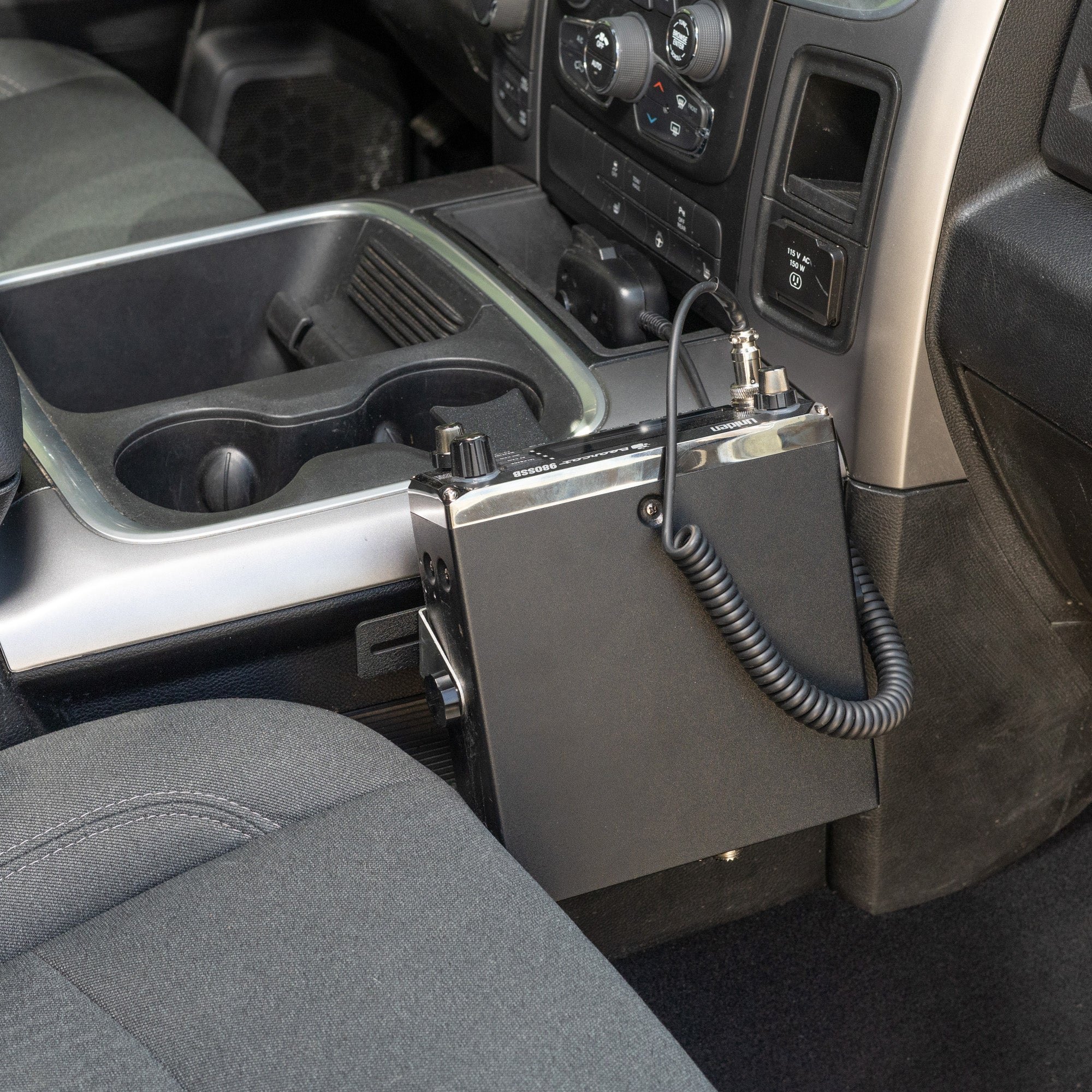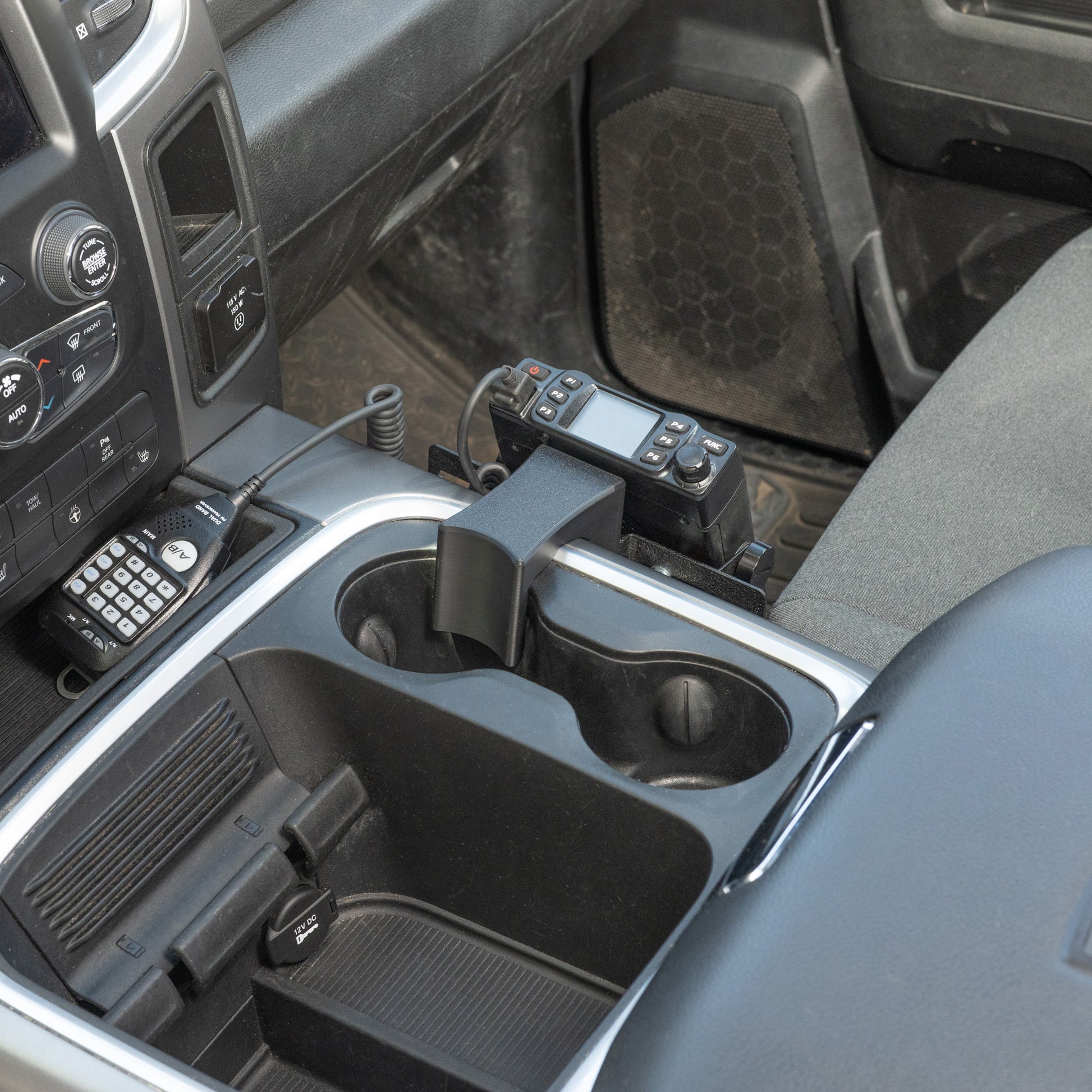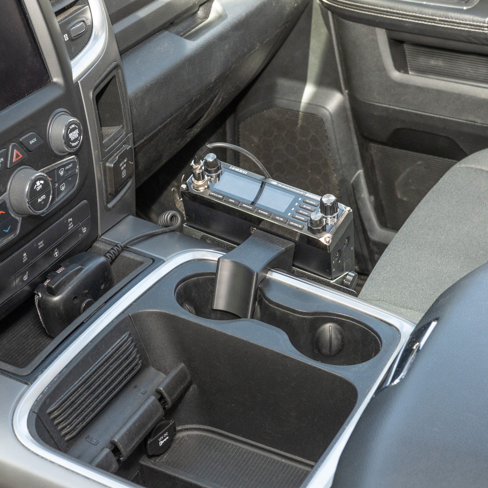 If you've been looking for how to install a CB radio, ham radio, GMRS radio, scanner, or other two-way radio in your RAM, this is a great option. It attaches securely to the console in the frontmost cup holder. The mount is easily removable if you want the radio out of the way, but it maintains a strong connection to the console when in use.