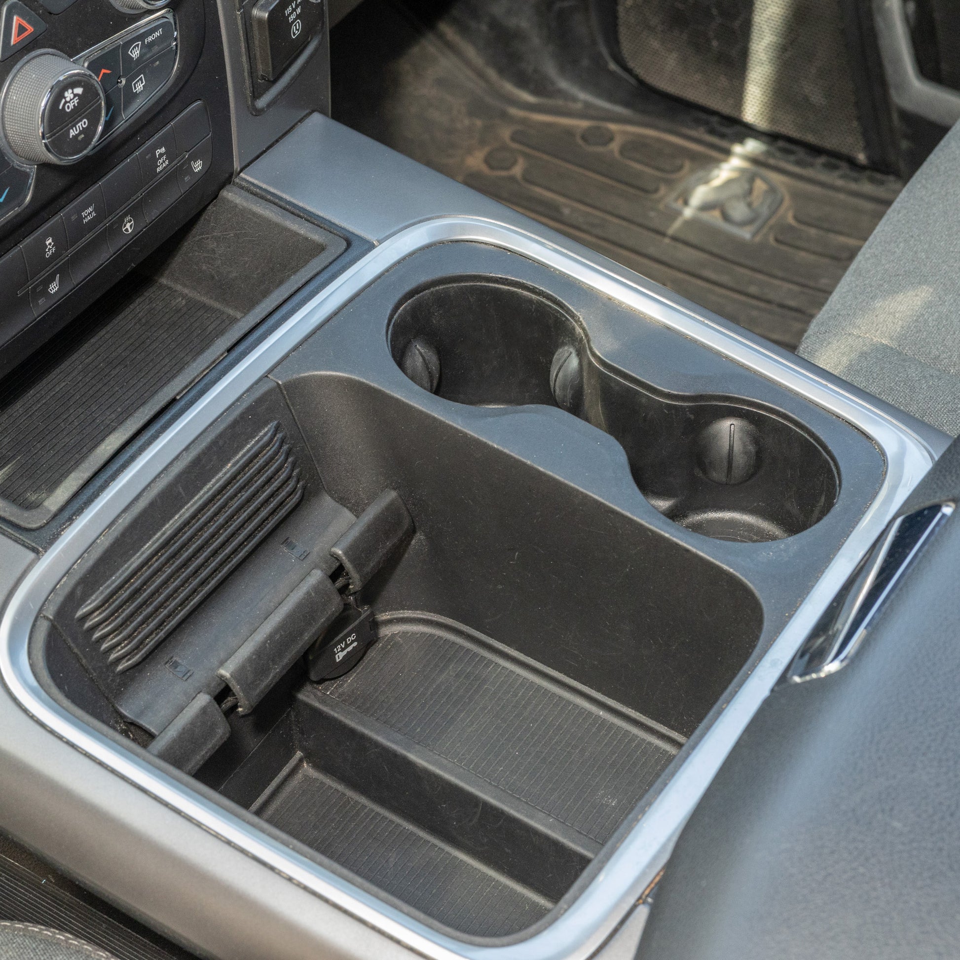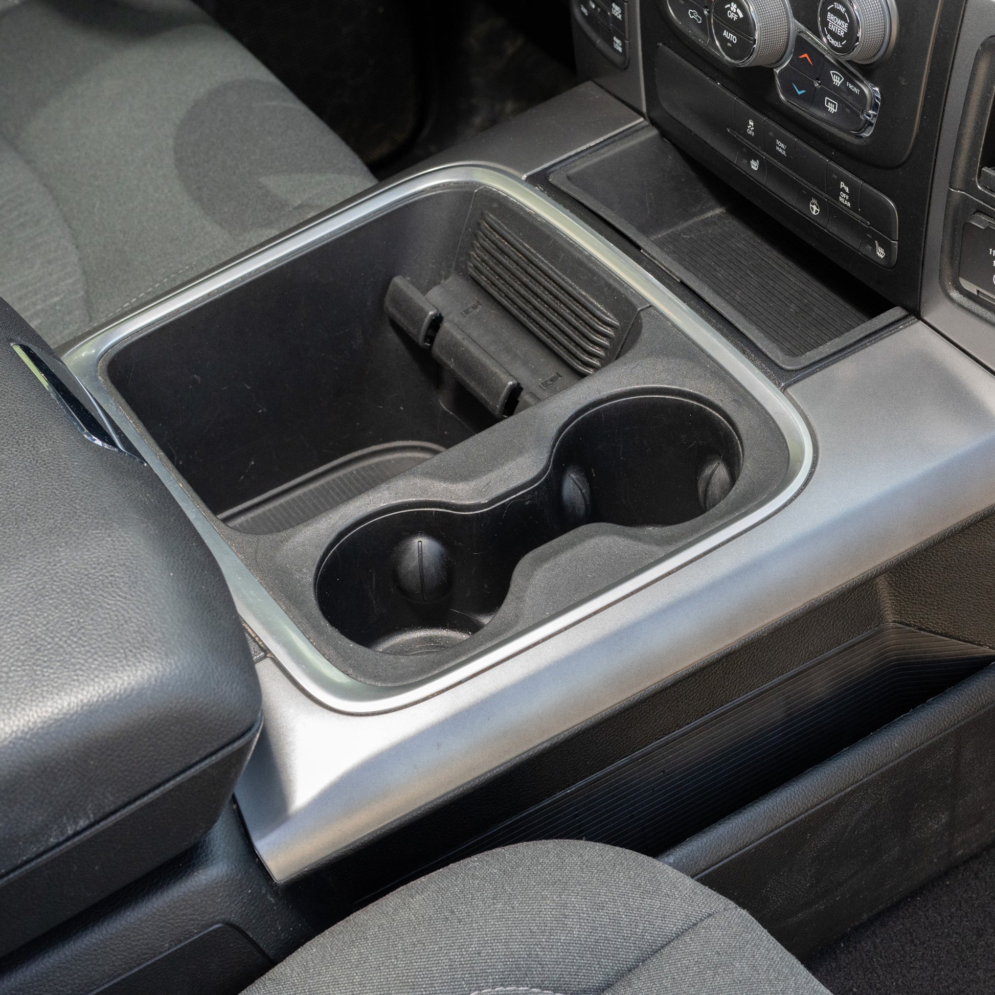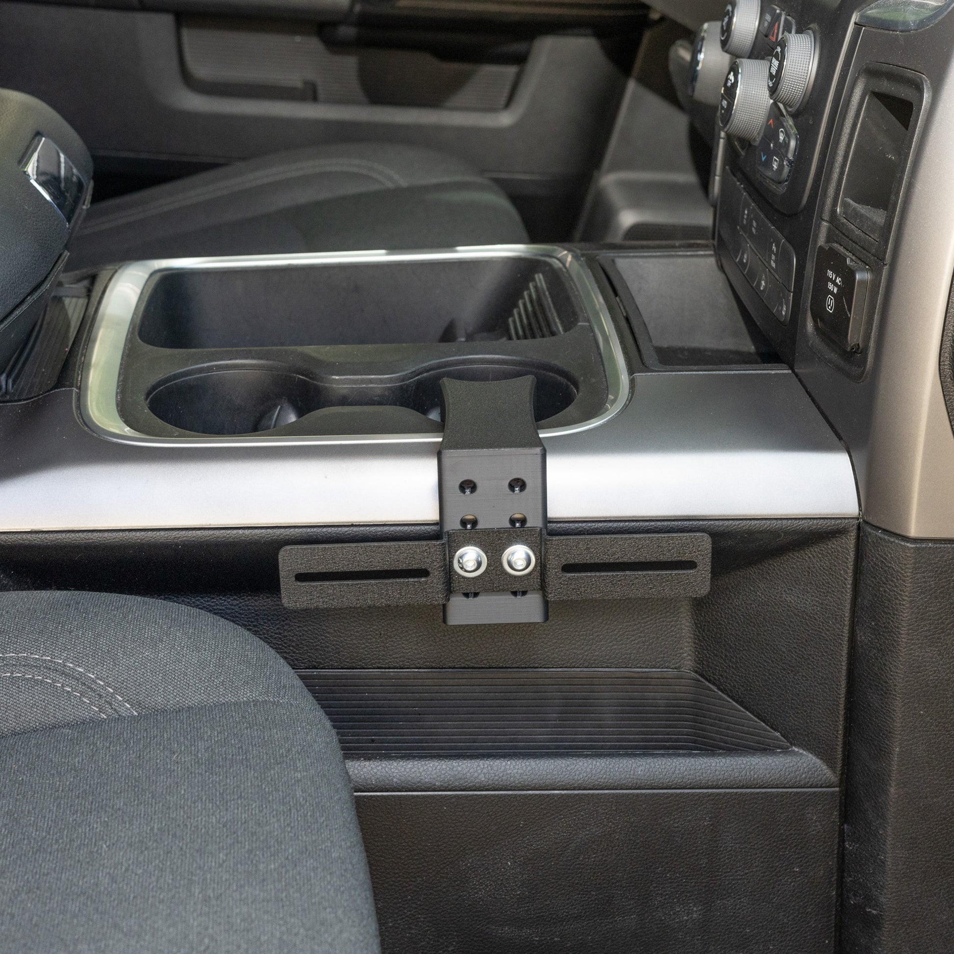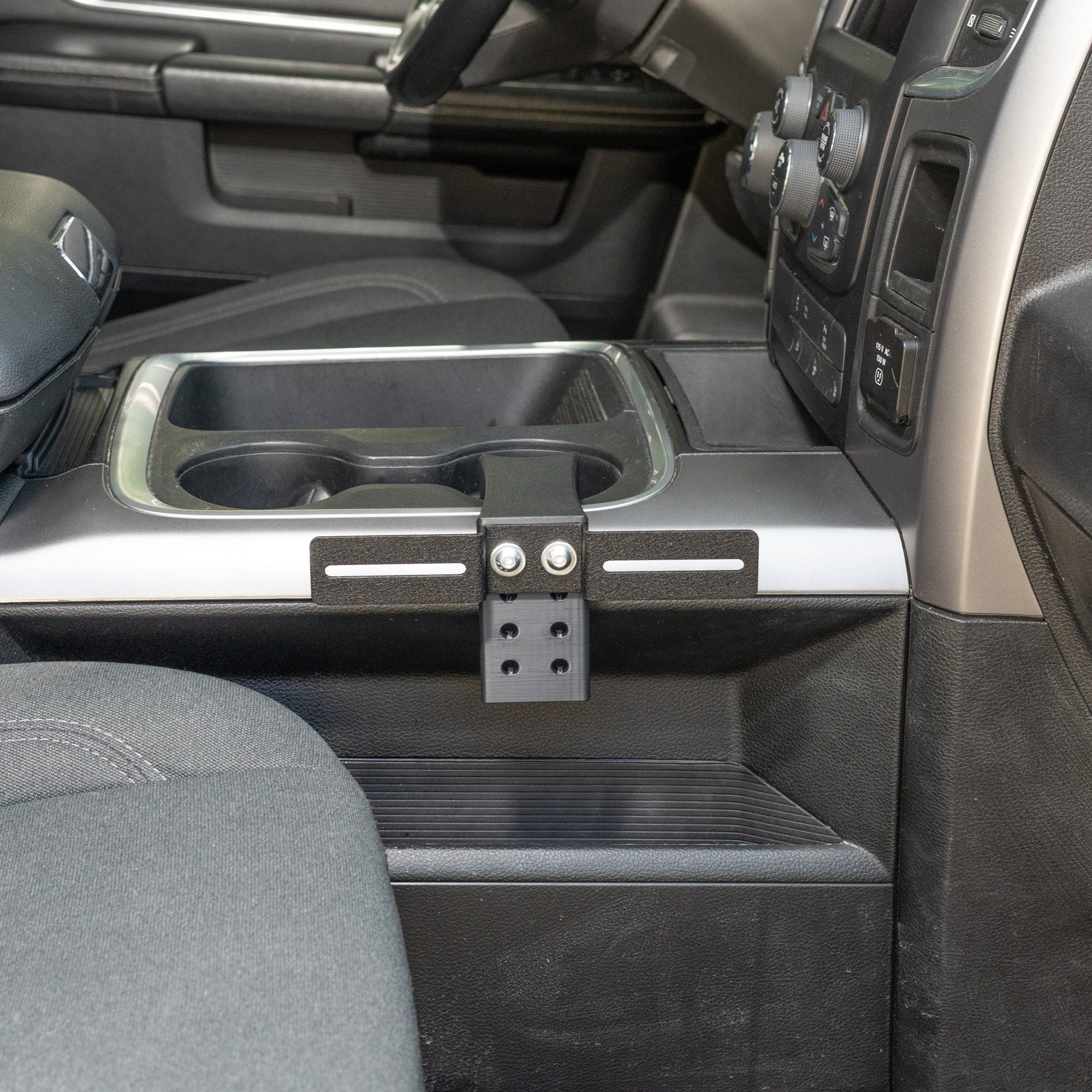 If you've been looking for how to install a CB radio, ham radio, GMRS radio, scanner, or other two-way radio in your RAM, this is a great option. It attaches securely to the console in the frontmost cup holder. The mount is easily removable if you want the radio out of the way, but it maintains a strong connection to the console when in use.