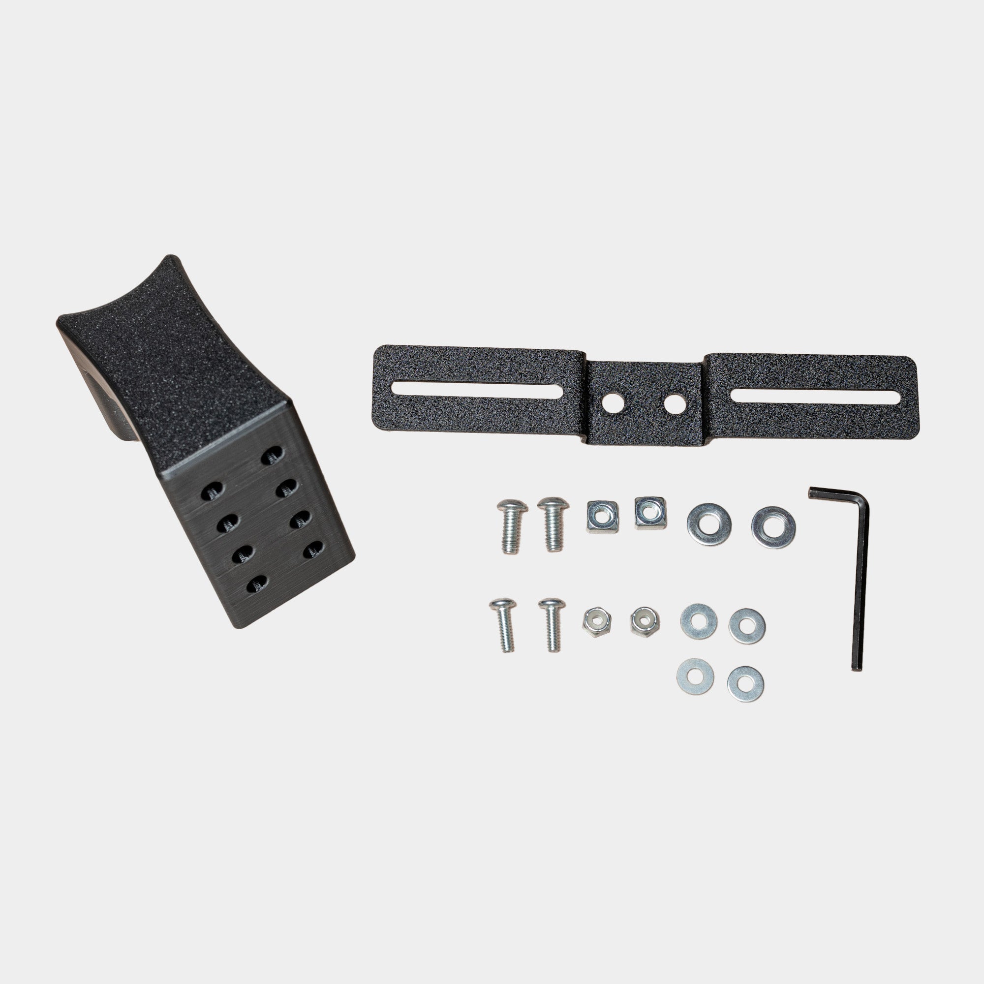 The Mounting Plate is 14 gauge steel, powder-coated black. The Mount Base is a printed part made of ABS.